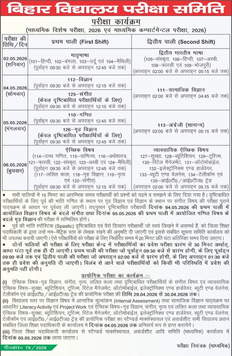 The Bihar School Examination Board (BSEB)Bihar Board 10th Compartment Exam Date 2026 |
