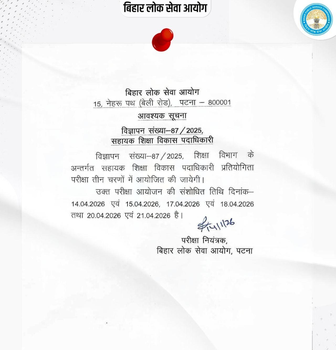 | BPSC AEDO Exam Date 2026 | 14, 15, 17, 18, 20, And 21 April 2026 |