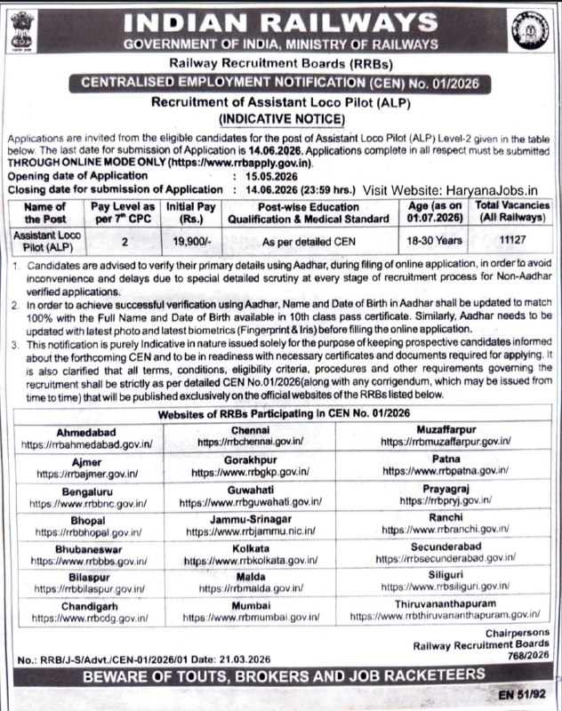 Short Discription:- Railway Recruitment Board (RRB) Has Released Short Notification (Advt. No CEN – 01/2026) for Railway RRB ALP  Recruitment 2026 (Assistant Loco Pilot) at @indianrailways.gov.in. A Total Of 11,127 Post. Will be Filled Under This Recruitment. Interested And Eligible Candidates Can Apply Online From 15 May 2026 to 14 June 2026. Candidates Are Advised To Read The Official Notification For Complete Details to Regarding Application Dates, Eligibility Criteria, Total Posts, Selection Process, Age Limit, Salary, And Other Important Information.